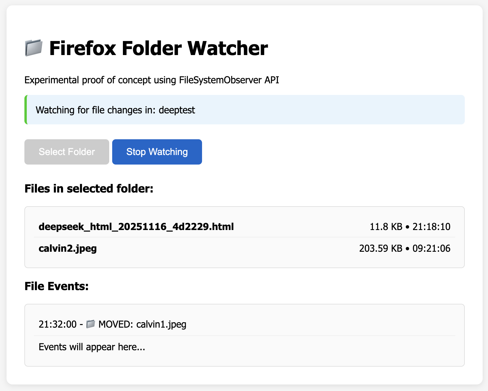 <p>Experimental proof of concept using FileSystemObserver API</p>
